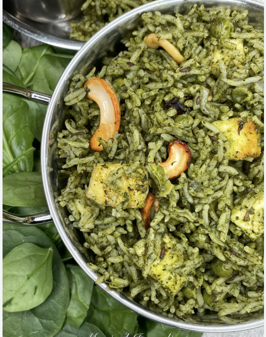 100g paneer, 2 cups spinach, ½ cup cooked rice, 1 tomato (pureed), ½ tsp garam masala, salt, 2 tbsp water