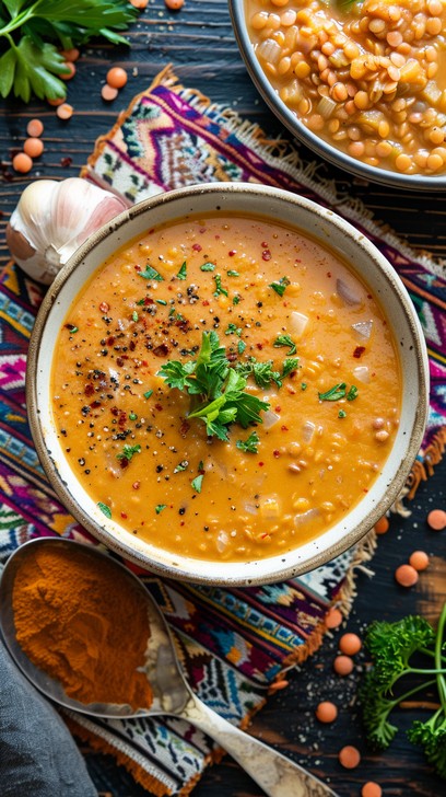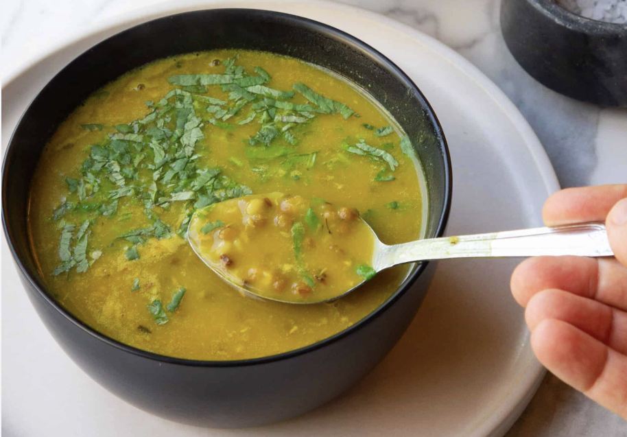 ½ cup cooked masoor dal, spinach-cucumber juice (2 cups), ½ tomato, ginger, cumin, salt, lemon