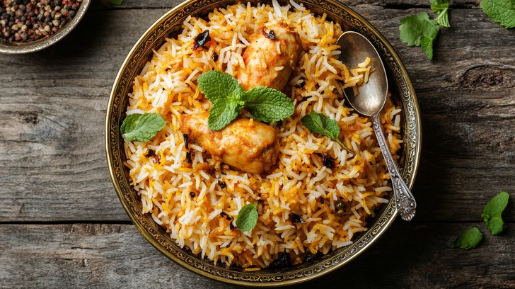 Marinate chicken with yogurt and spices for 5 minutes. Heat induction cooktop, sauté onions, then add chicken, grains, vegetables, and water. Cover and cook for 18–20 minutes until done.